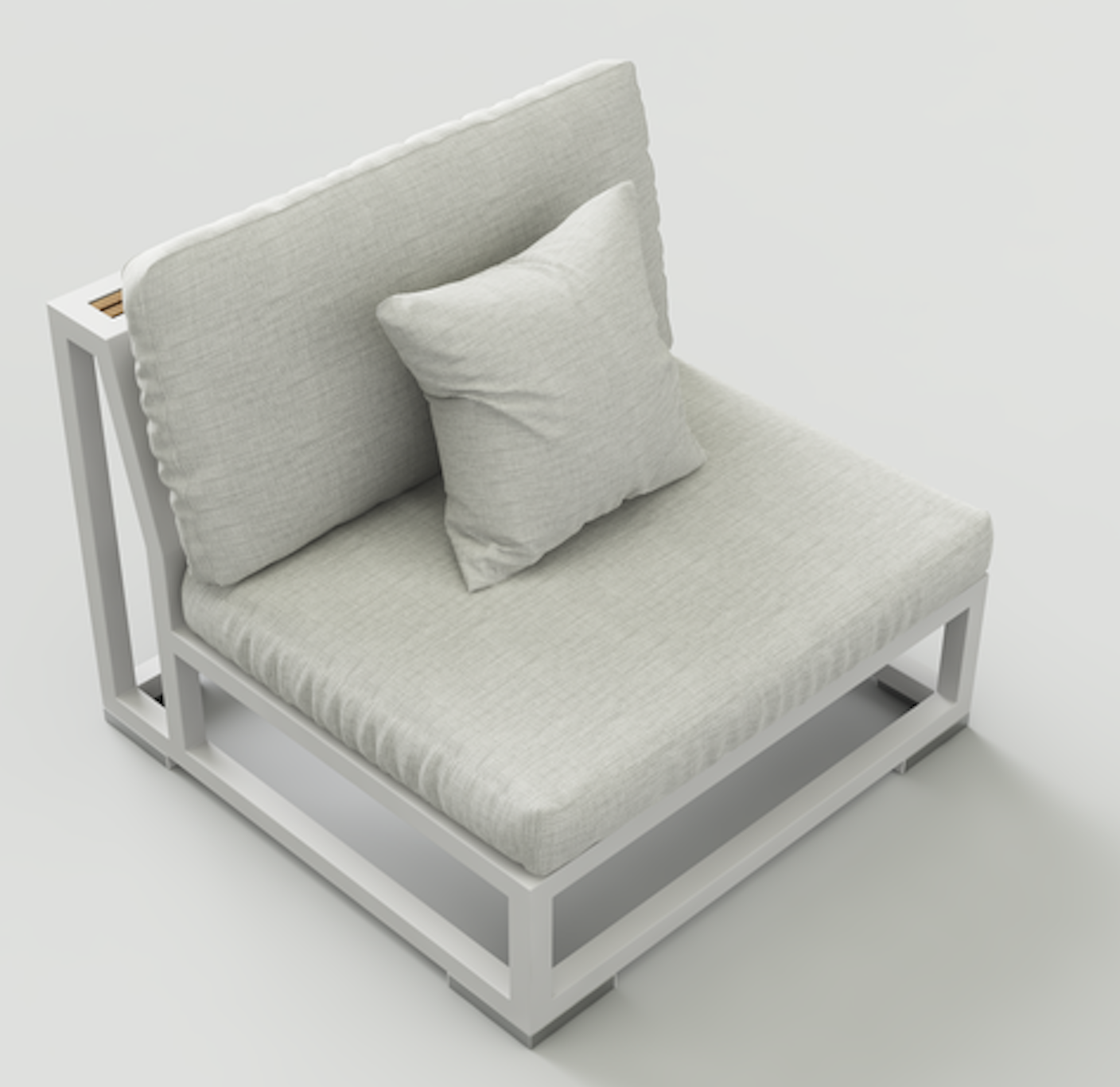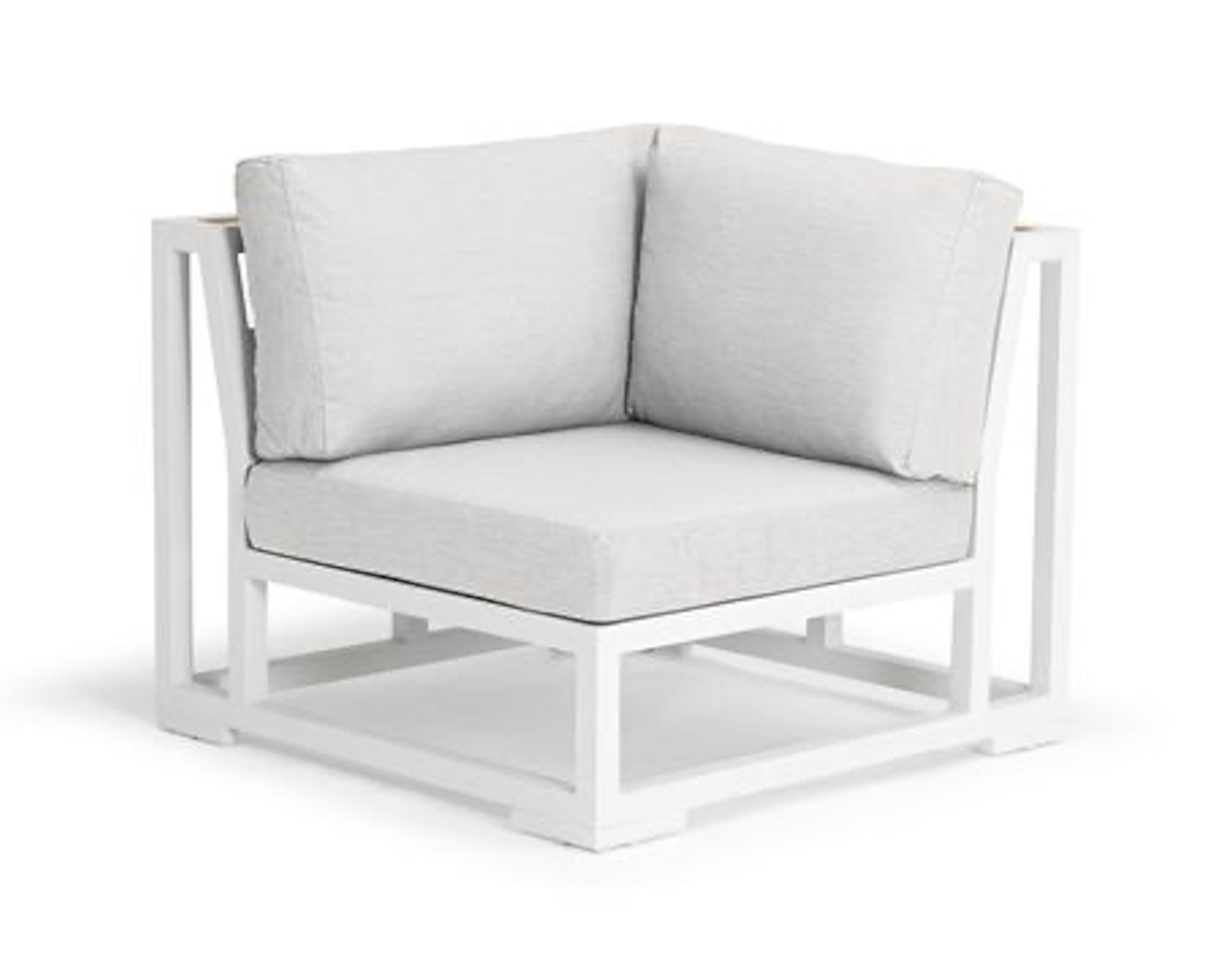 Modern outdoor sofa modular with welded aluminium frame, faux teak wood arms, Tiger brand powder coating frame, uv treated outdoor, waterproof fabric and high density foam.