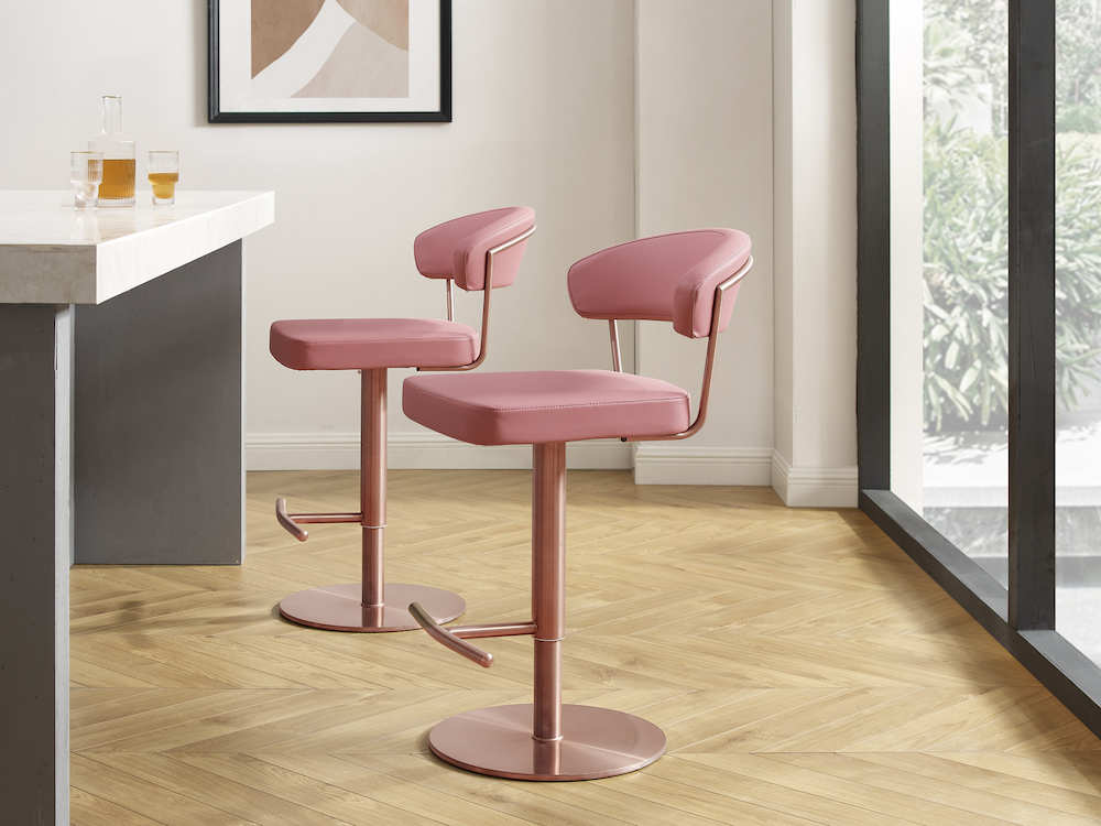 Modern pink faux leather barstool with a rose gold brushed stainless steel swivel base.