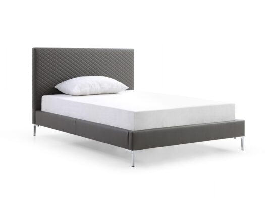 Modern bed, fully upholstered in grey or white faux leather with chrome legs. Available in Queen, Full and Twin size.