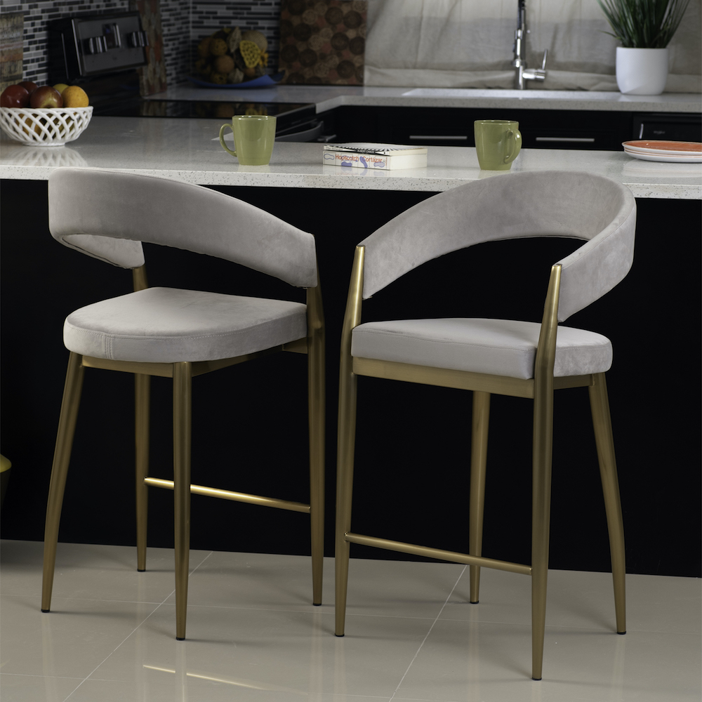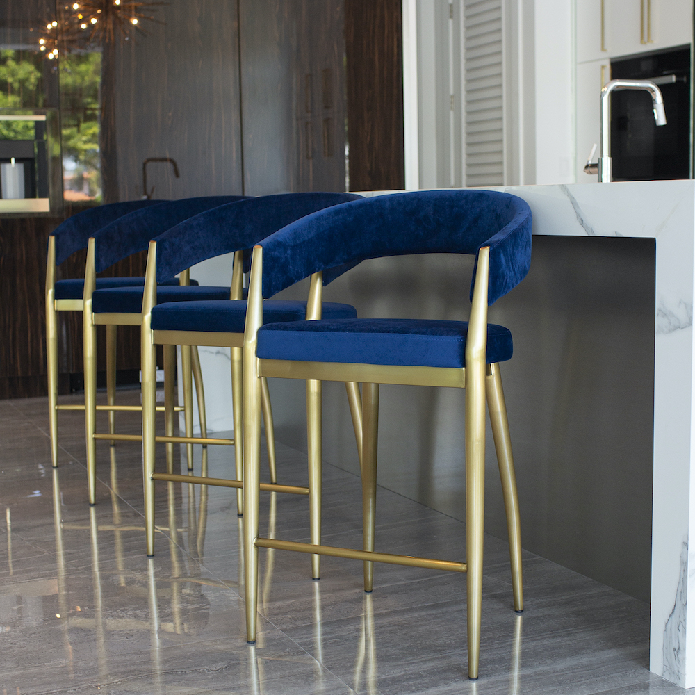 Modern gray or blue velvet bar stool with gold finish stainless steel tapered legs.