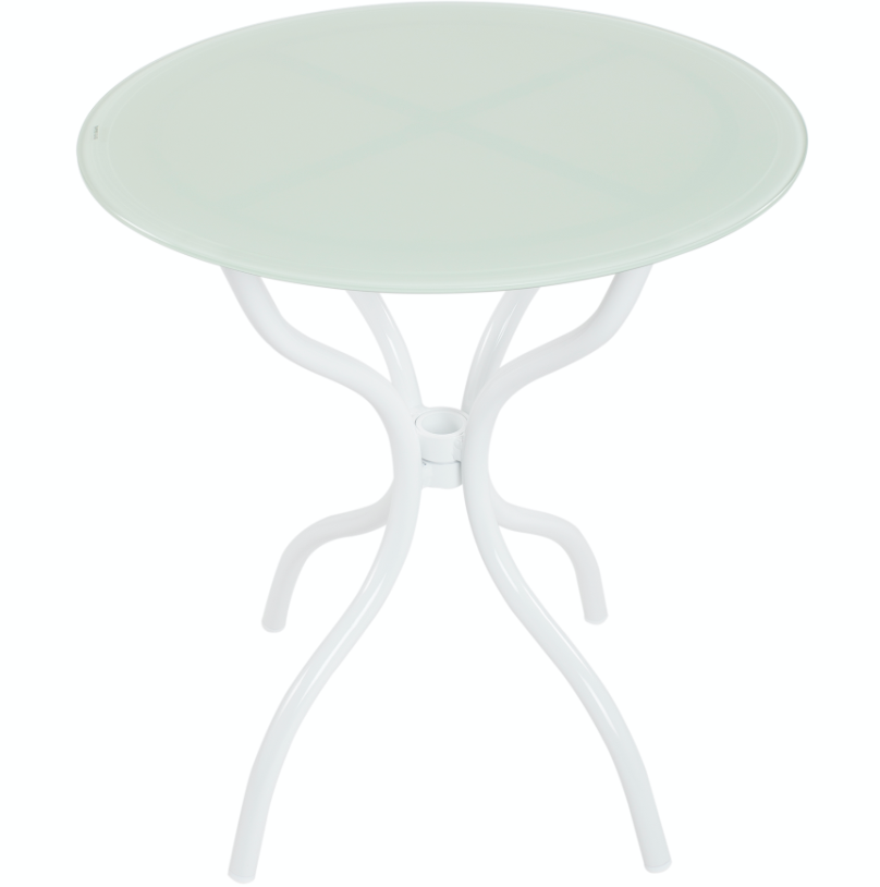 Modern outdoor end table with tempered glass top and aluminum frame finished with polyester powder coating.