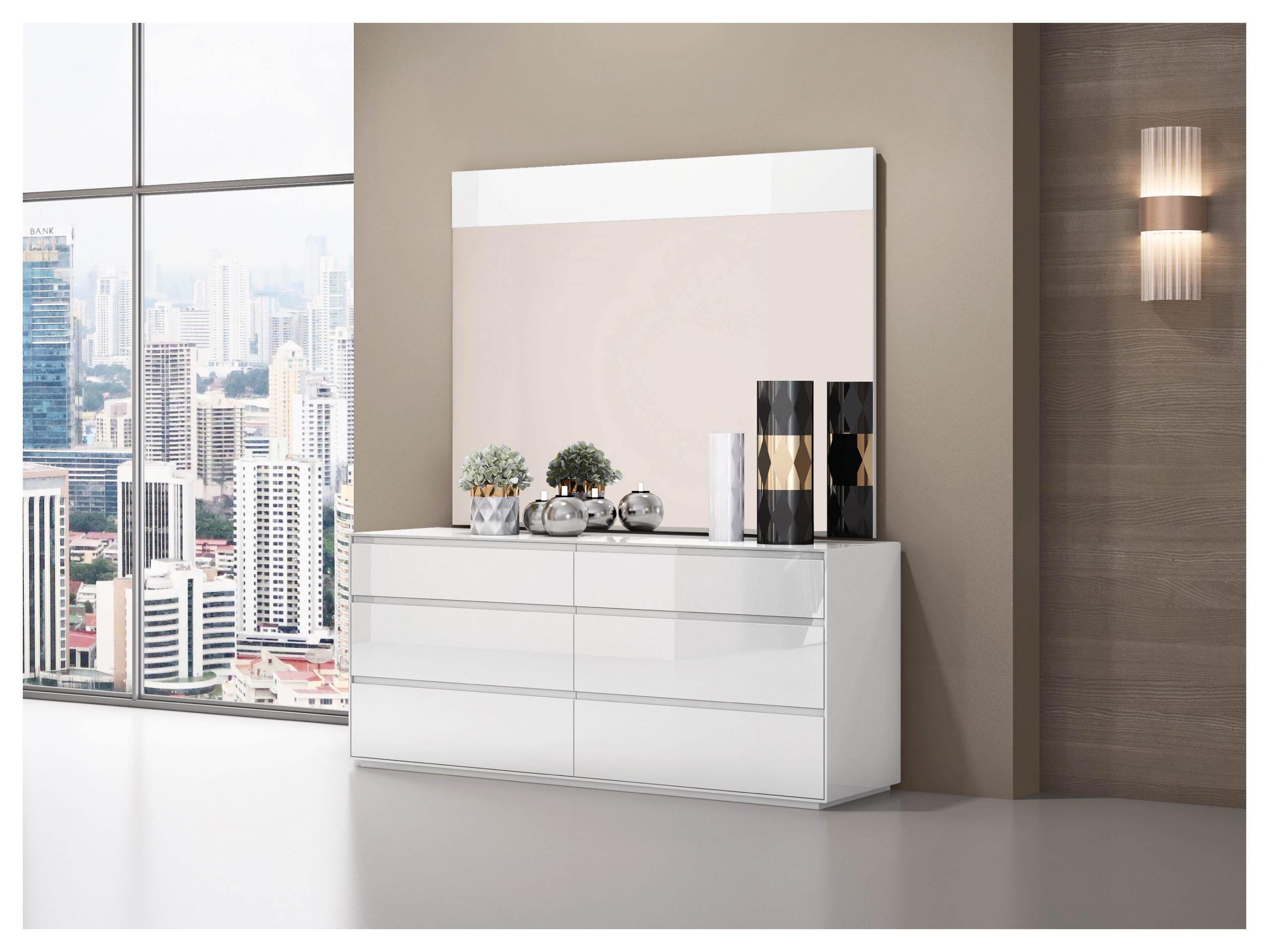 High gloss double dresser in white with 6 self closing drawers.