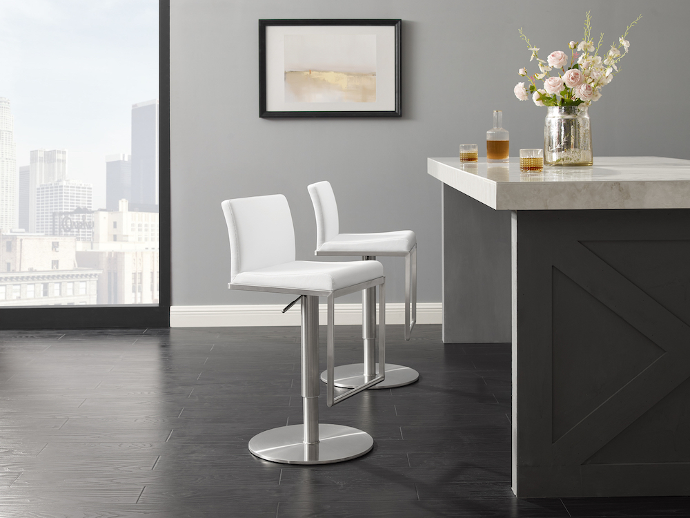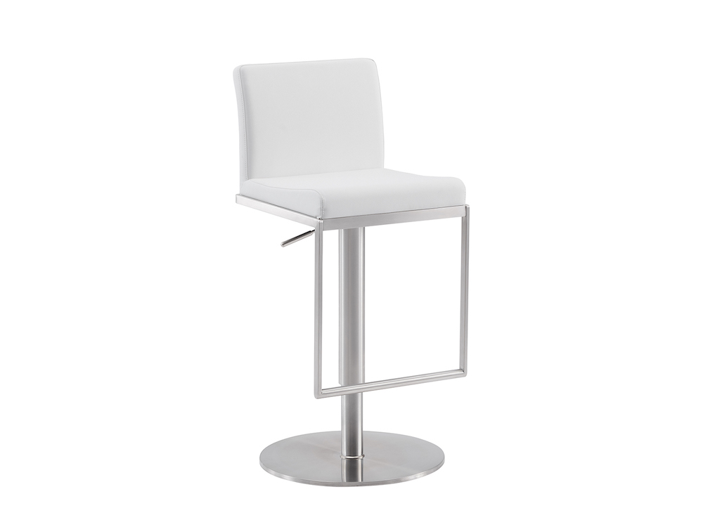 Modern barstool in light gray, white or black faux leather with a brushed stainless steel swivel base.